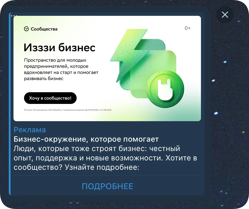 Такая реклама показывается всем пользователям Telegram, кто входит в вашу целевую аудиторию и у кого нет подписки на Telegram Premium.