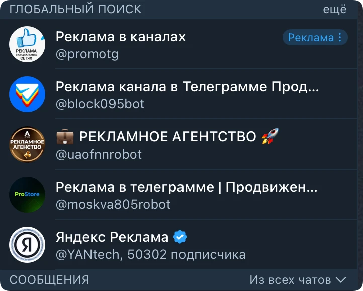 Ограничения: Реклама показывается только в каналах-партнерах Рекламной сети Яндекса (их тысячи, но это не все каналы мессенджера).
