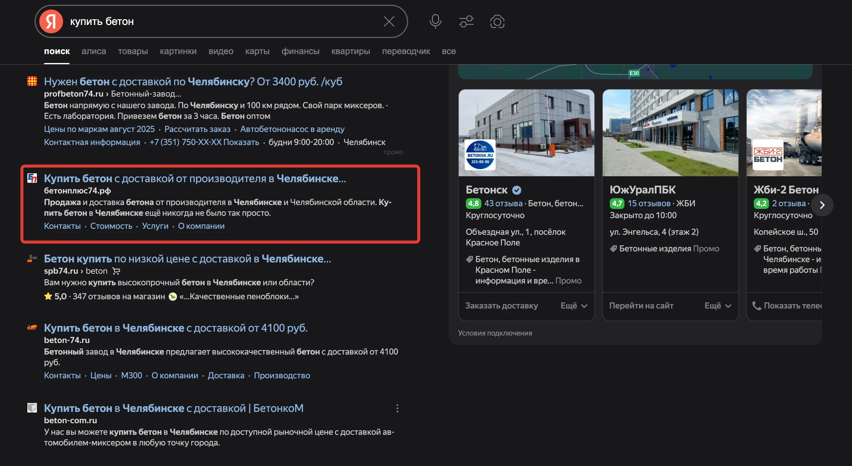 - Сегодня (работаем с 2021 года): «Бетон Плюс» — наш постоянный партнер. Мы не просто поддерживаем результат, а постоянно развиваем проект: дорабатываем сайт, активно ведем Яндекс.Карты, 2ГИС и другие сервисы, превратив онлайн-присутствие клиента в мощную экосистему для привлечения заказов.